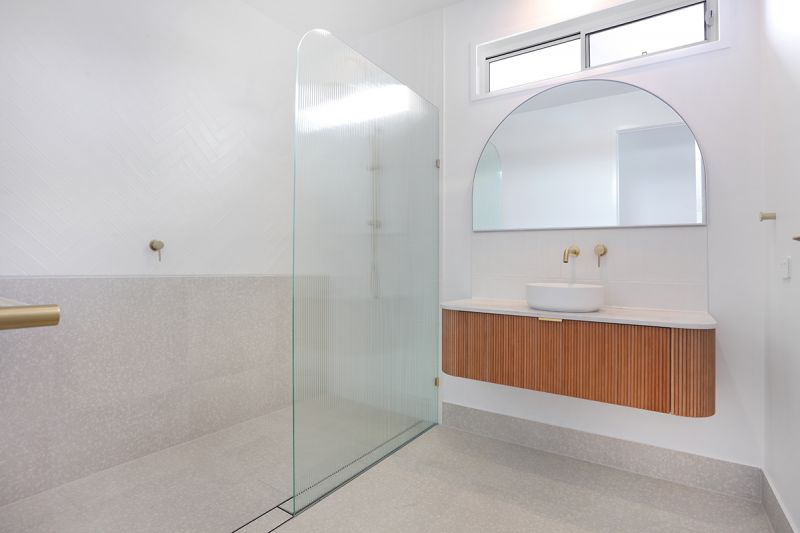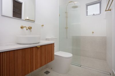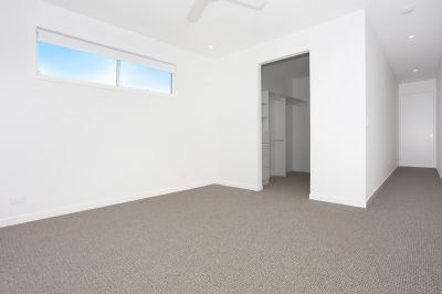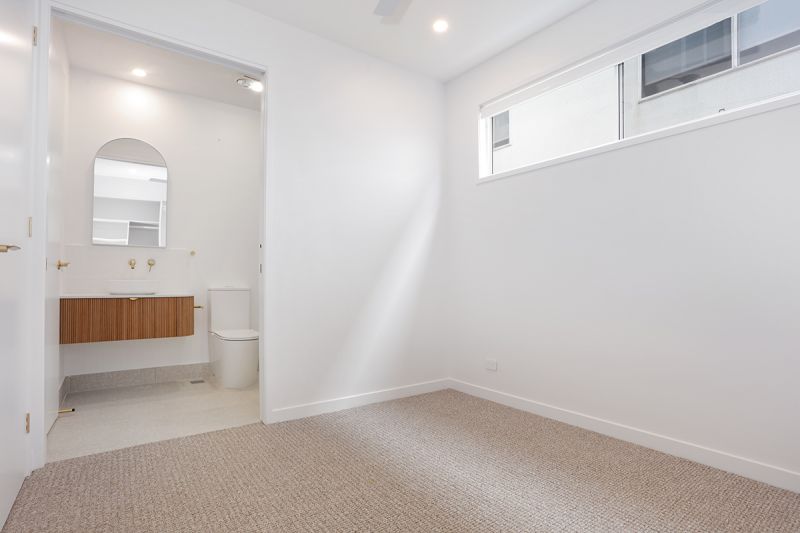 Downstairs : Bedroom and two-way bathroom. Open plan kitchen, living, and dining leading to private low maintenance courtyard. Single garage with laundry and storage.