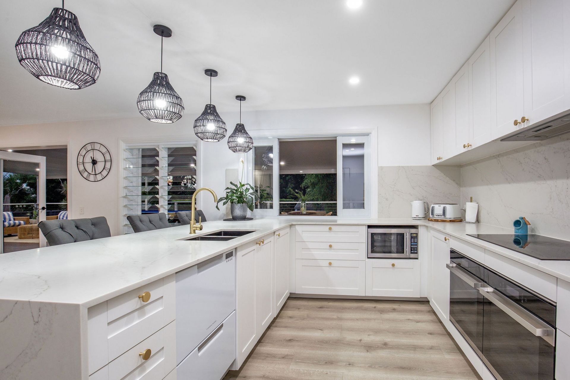 A matching modern bathroom continues the theme of class and elegance before you step down to the immaculate open plan living, dining and high end kitchen precinct, equipped with stone splashback and stone bench tops, huge island bench, Ariston induction cooktops, plus two Ariston ovens.