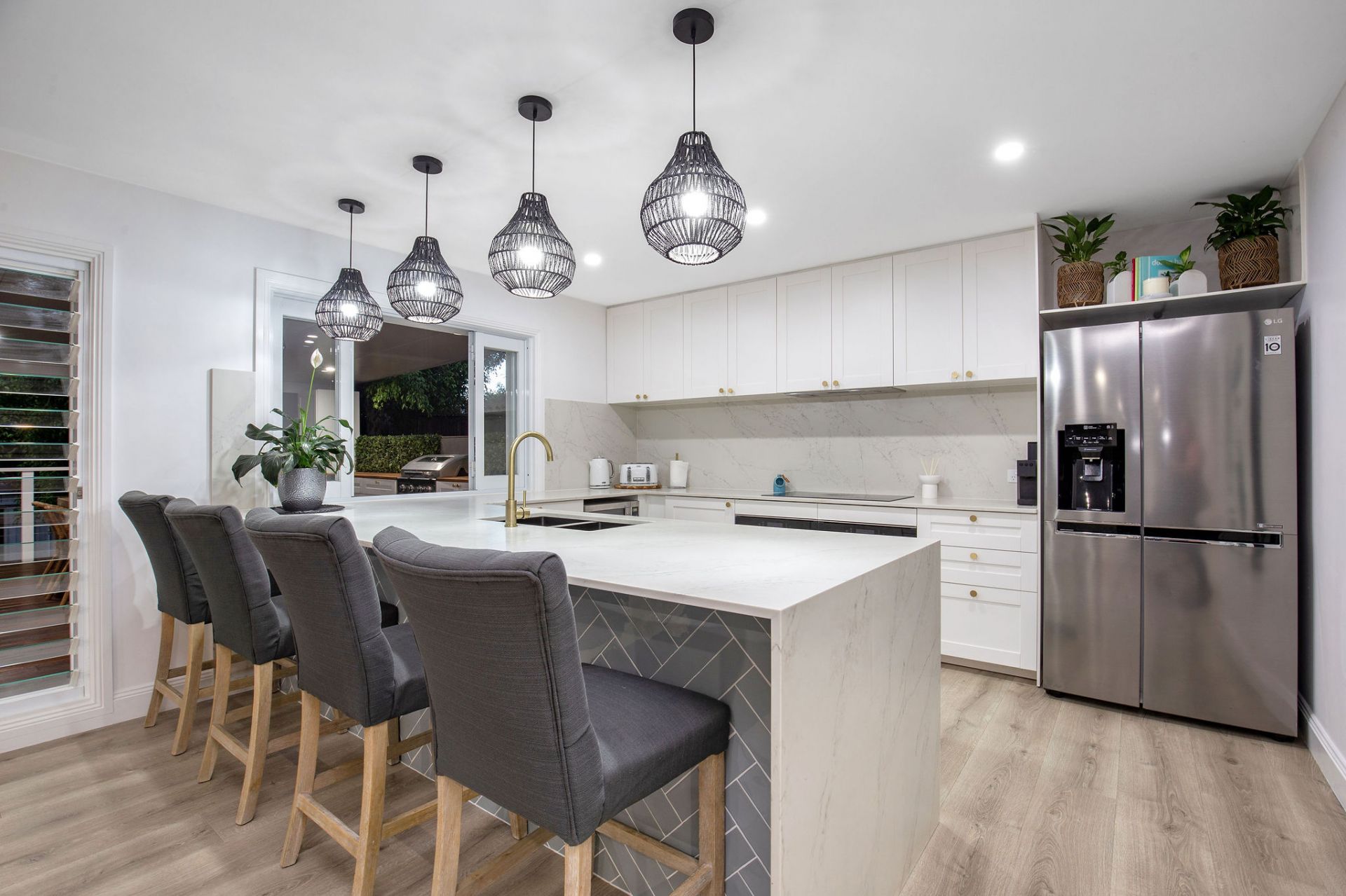 Featuring a flawless floor plan which includes the incredible master suite with walk in robe and designer ensuite with stone basins, brushed brass tap wear and chevron marquina splashback on the entrance level. Four additional oversized bedrooms complete with VJ paneling, plantation shutters & built-in wardrobes are conveniently located on the same level. A study completes this area with the option to work from home with external access.