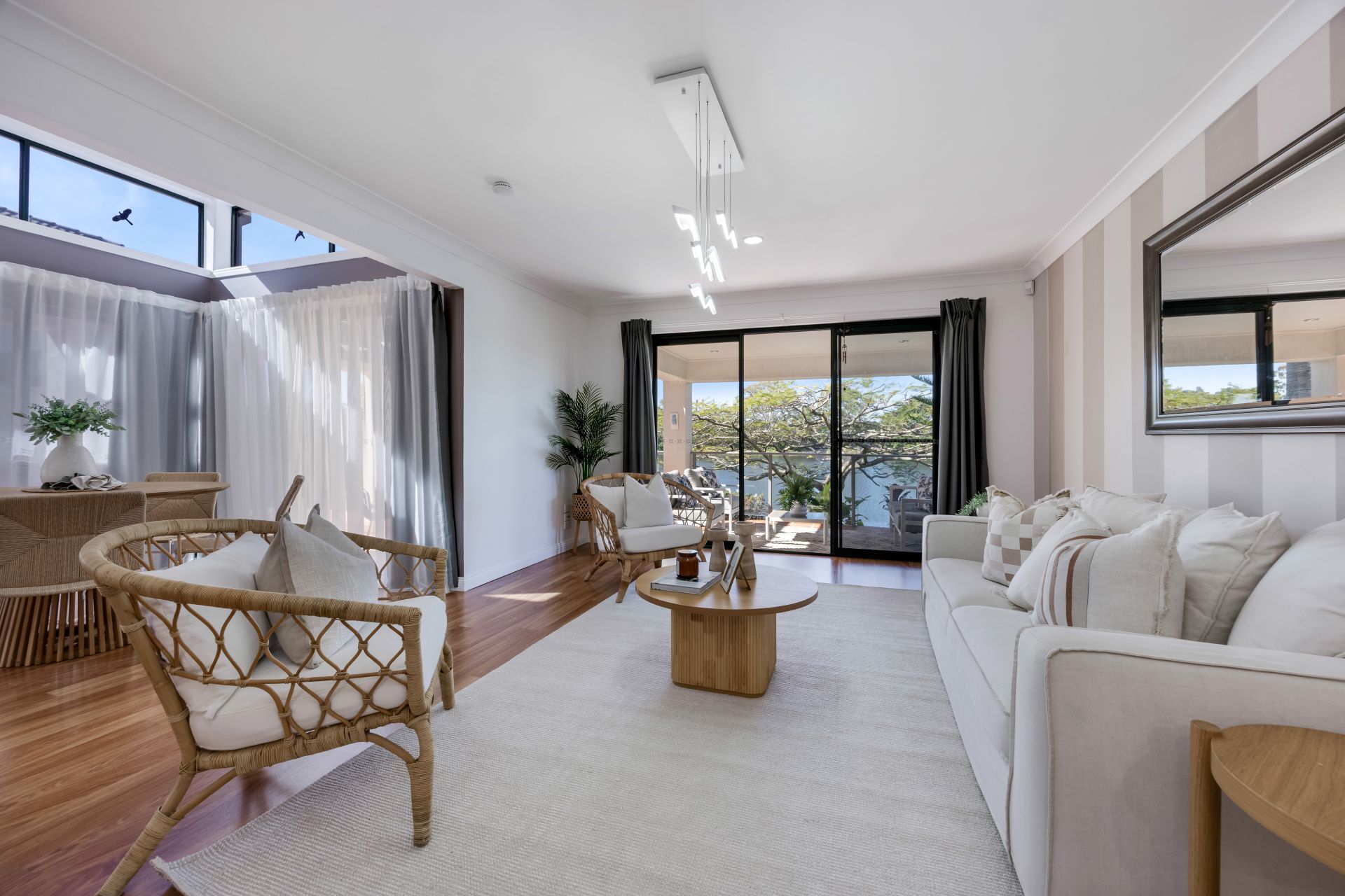 The interior of the home is equally impressive, featuring a high void to the second level creating an abundance of light and space. All the internal living spaces lead seamlessley via sliding doors to the alfresco living and dining areas.